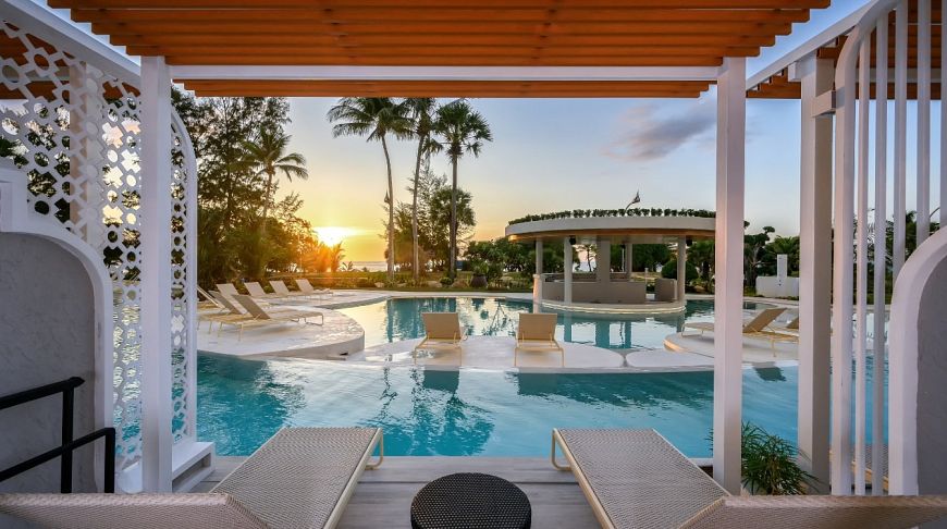 Атмосферу оазиса создает бассейн, окруженный садом с пышной тропической растительностью. Тут особенно приятно проводить время в полуденный зной с бокалом вина или коктейлем из бара. Всего на территории отеля расположено 4 бассейна и комплекс с водными горками прямо на пляже!